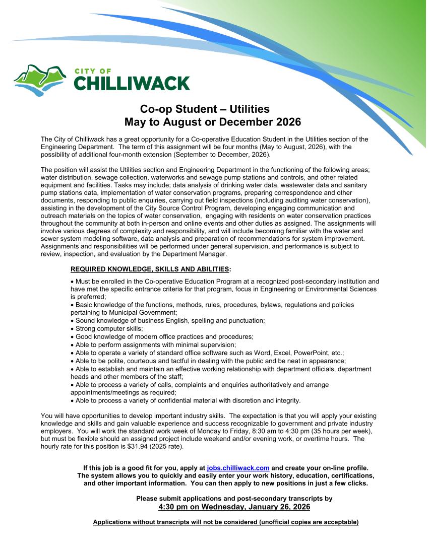 | Title: | Co-Op Student - Engineering - Utilities (May to August or December 2026) |